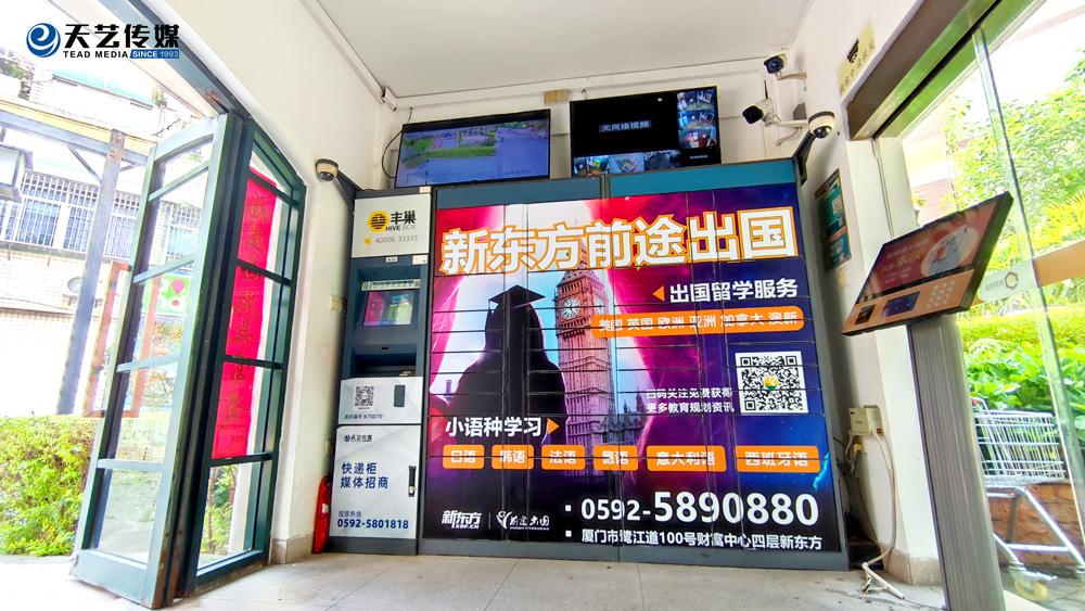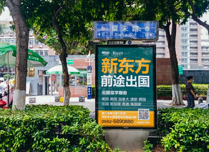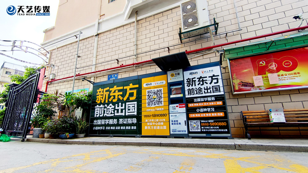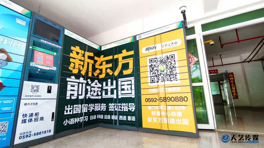 廈門新東方前途出國服務(wù)機(jī)構(gòu)位于鷺江道財(cái)務(wù)中心四樓,與廈門天藝傳媒合作,目前在主干道路名牌與生活小區(qū)的快遞柜媒體進(jìn)行部分宣傳合作。