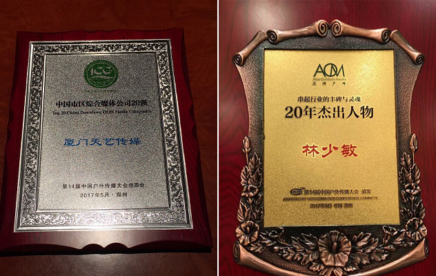 在剛剛落幕的第14屆中國戶外傳播大會上,廈門市天藝傳媒股份有限公司憑借20余年的媒體經(jīng)營實力、誠信可靠的行業(yè)口碑及強大的市場占有率,在第六屆中國百強媒體評選中,從眾多優(yōu)質(zhì)候選企業(yè)中脫穎而出,榮獲“中國市區(qū)綜合媒體公司20強”稱號。作為戶外廣告行業(yè)的標桿人物,天藝傳媒董事長林少敏被授予“20年杰出人物”榮譽稱號!