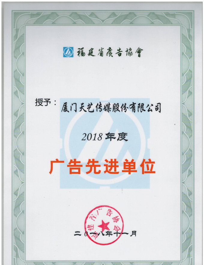2018年福建省廣告界在推動(dòng)廣告業(yè)發(fā)展中,勇于開拓,努力創(chuàng)新,取得了優(yōu)異的成績,為福建經(jīng)濟(jì)發(fā)展和社會(huì)進(jìn)步作出了巨大貢獻(xiàn),涌現(xiàn)了一批先進(jìn)單位。為了表彰先進(jìn),樹立典型,推動(dòng)工作,再創(chuàng)輝煌,福建省廣告協(xié)會(huì)于12月20日舉辦了第七屆第三次理事會(huì),并授予了廈門市天藝傳媒股份有限公司“福建省廣告先進(jìn)單位”的稱號。